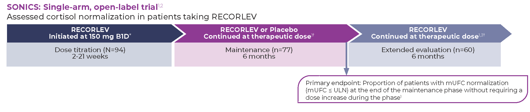 The SONICS study evaluated the efficacy and safety of RECORLEV® in patients with Cushing’s syndrome in a multicenter, open-label study consisting of 3 phases.