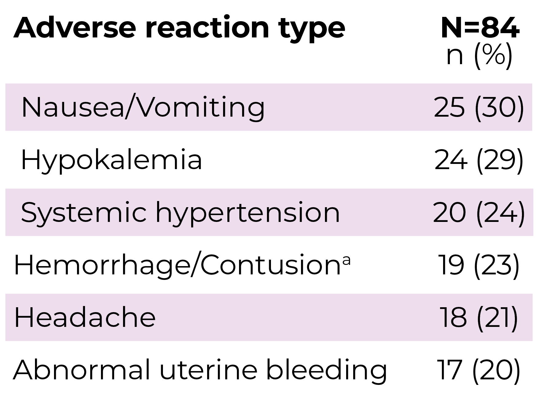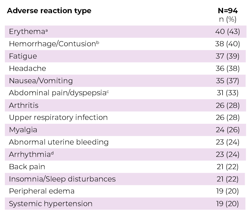 aHemorrhage/contusion includes blood urine present, epistaxis, eye hemorrhage, gingival bleeding, hematoma, hematuria, hemorrhoidal hemorrhage, melena, and scleral hemorrhage.